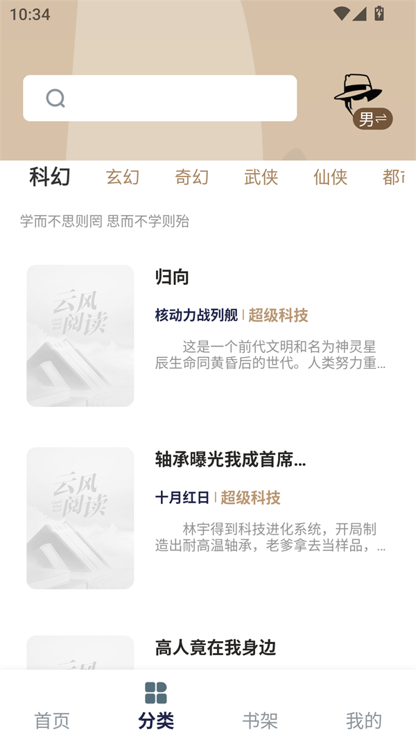 2、通过分类板块浏览都市、玄幻、言情、悬疑等题材小说。
