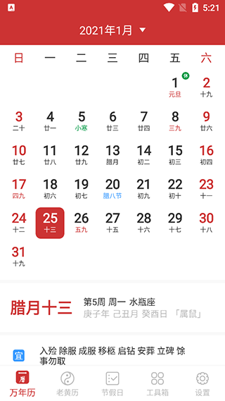 2、点击老黄历,支持查看本年的年份,比如2021是庚子年;