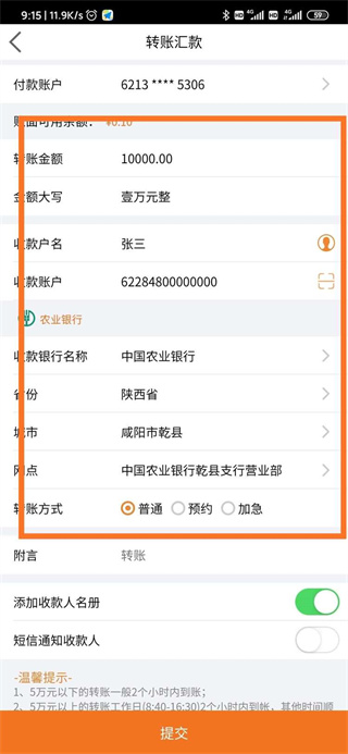 2、填入对方姓名 账号 金额 具体开户行 然后点击下一步;