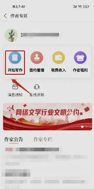 进入作者专区后,您将看到一个醒目的“开始写作”按钮,点击它开始您的创作之旅。
