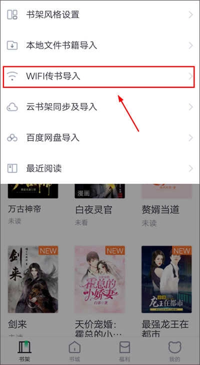 1、当电脑与手机处于同一WiFi网络环境下时,打开熊猫看书免费版,依次点击【书架】-【右上角菜单】;
