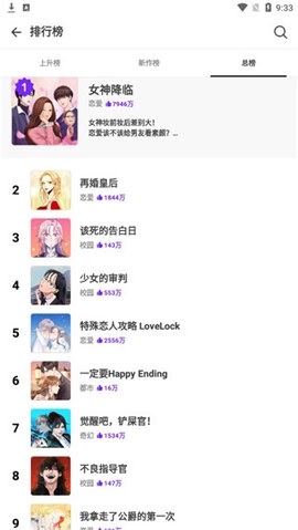5、点击排行榜,这里有上升榜、新作榜和总榜可供选择,当你不知道看什么漫画时,不妨来这里找找灵感哦。