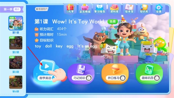 在课程页面,点击趣学英语按钮,即可进入英语学习内容页面。