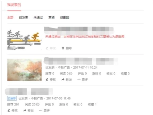 5、内容管理,你可以在今日头条上通过这个功能查看自己发布的内容是否获得推荐,了解具体的阅读量数据,以及这些内容为你带来了多少新增粉丝,还有多少用户进行了评论、转发和收藏操作。今日头条的这个页面设计得相当不错。