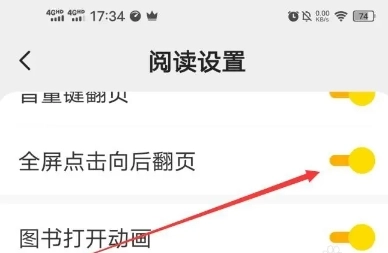 5、待“阅读设置”窗口弹出后,找到【全屏点击向后翻页】功能项并将其激活,即可完成设置。
