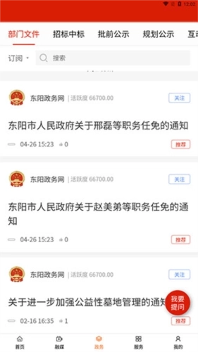 3、在【政务】页面,我们还能看到大量政策文件信息,像部门文件、招标中标、批前公示等内容。