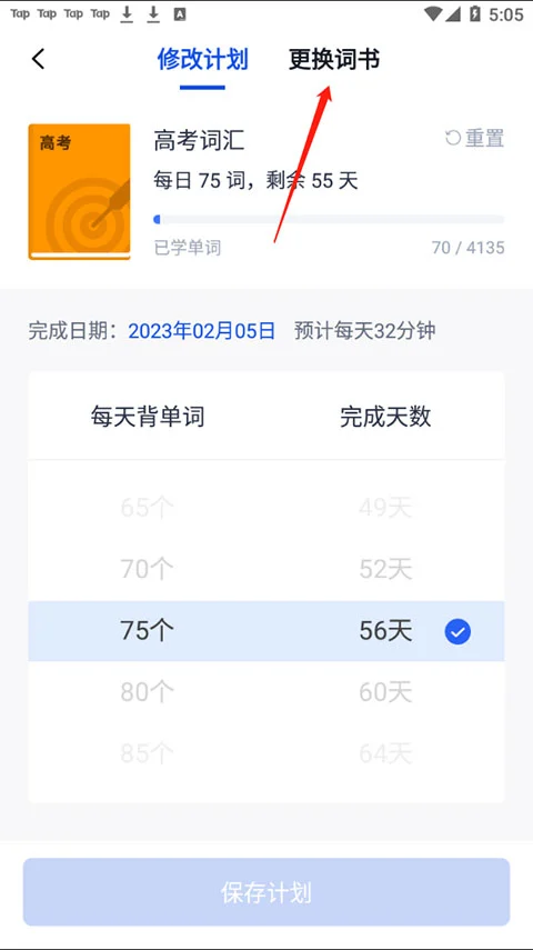 2、目前正在学习的词书无法直接删除,仅能进行重置操作。若有删除需求,需先切换至其他学习计划,随后重复之前的操作步骤即可完成删除。