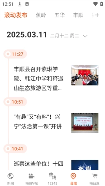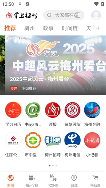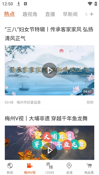 2、在梅州V视的界面中,我们能够浏览一系列热点、直播以及新闻类视频内容。