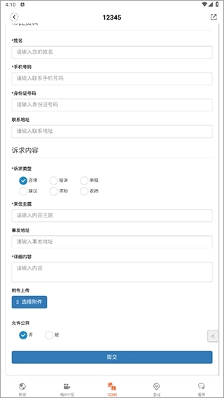 2、进入界面后,填写市民资料,选定求助类型、输入主题内容等信息,然后点击提交按钮就可以了。