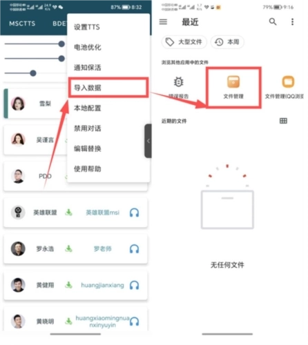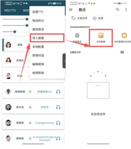 1、点击软件右上角的按钮选择导入语音包,稍作等待即可看到数据;导入成功后,就能对这些声音进行试听和编辑操作,长按声音对应的头像,还能单独调整其语速、音量等参数;