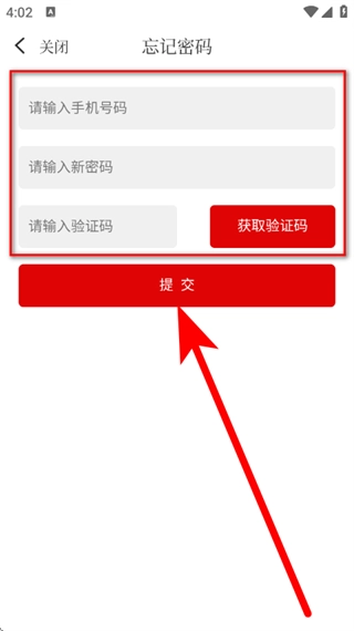 在密码找回页面,输入手机号、设置新密码并填写验证码后,点击提交按钮,即可完成密码重置操作。