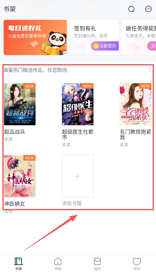打开App后先别忙着看书,记得先去书架页面的活动区签到领取福利,建立个人书库其实很简单哦。