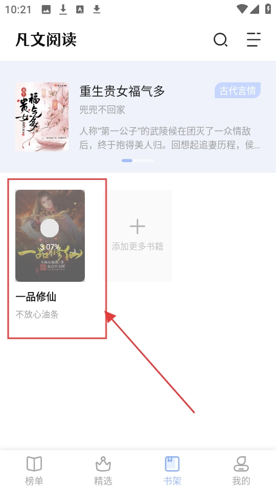 在书架页面可以找到《一品修仙》这本书,点击后就能接着阅读或者查看缓存的情况,方便你随时沉浸在修仙故事里~