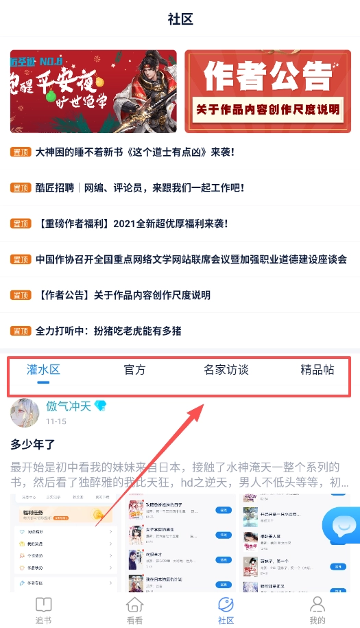 “社区”板块里的“作者公告”与“大神新书”这两类信息很值得留意,它们能助力你及时把握平台动态,让你不会错过每一部具有潜力的优秀作品。