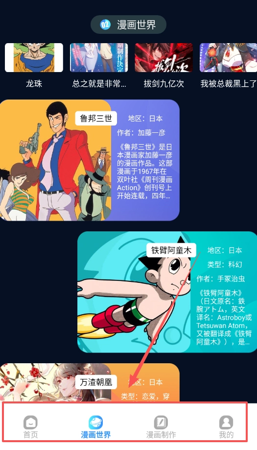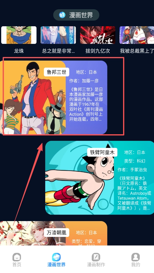 在漫画世界板块,你能够浏览龙珠、鲁邦三世这类热门作品,帮助你在深入阅读之前就对它们有一个全面的认识。