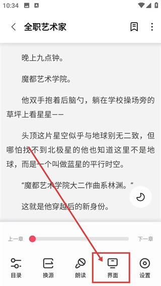 在阅读界面点击底部的【界面】按钮,即可打开界面设置面板,之后就能调整阅读的显示参数了。