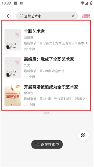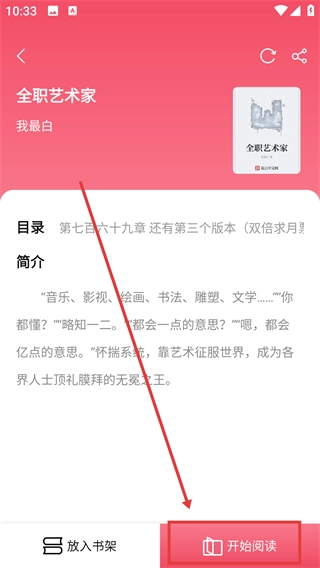 在搜索结果中找到【全职艺术家】的条目,点击该条目即可进入书籍详情页面,这样就可以准备进行阅读相关的操作了。