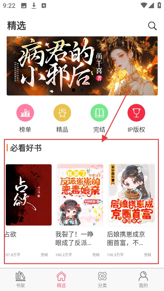 在软件精选页面的必看好书板块,点击任意书籍即可进入其详情页,查看并了解该书籍的具体信息。