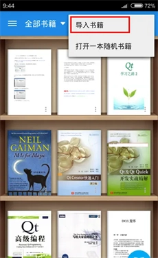 在书架主界面上,点击右上角的一排竖点(参见前面的两个图),然后在弹出的菜单中选择“导入书籍”(见下图)。