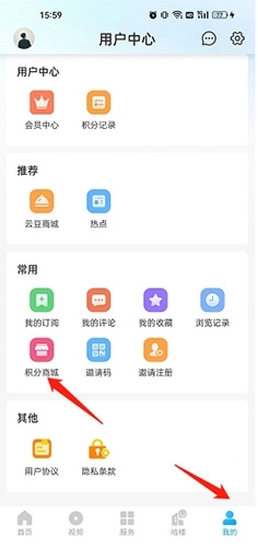 1、启动软件后,点击底部的“我的”按钮,接着选择“积分商城”选项。