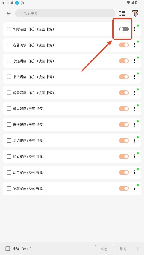2.书源右侧的开关按钮,开启即可。