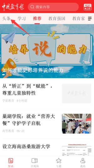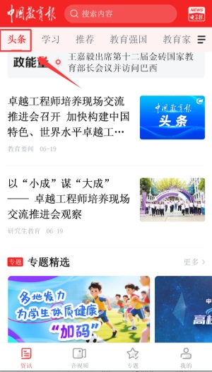 打开中国教育报后,在首页导航栏点击“今日头条”板块,该板块会每日更新并推送教育领域的重要资讯。