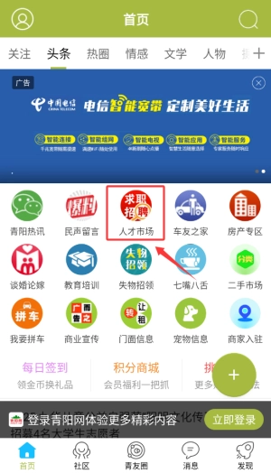 打开青阳网后,在首页的导航栏里找到并点击“人才市场”频道,该频道汇聚了各类企业的最新招聘信息。