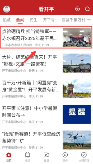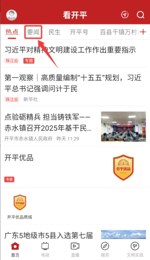 打开“看开平”,首先看到的是首页,首页上的要点新闻清晰明了,接着点击“要闻”专区即可。