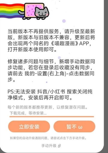 喵嗷漫画当前的最新版本为v1.1.2.3,此次更新幅度较大,安装新版本后可删除旧版本,直接使用新版本即可正常加载内容。