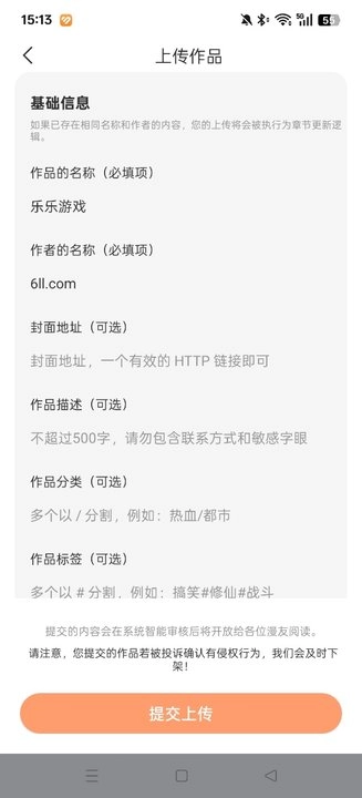 3、进入上传作品页面后,把各项主要基础信息补充完整并填写到位,点击提交按钮。待系统审核通过,就能在个人作者专栏查看自己发布的内容了。
