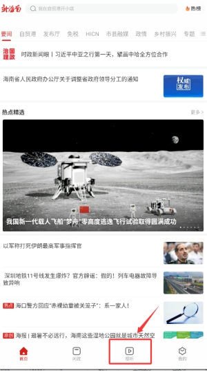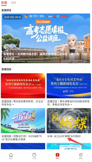 打开新海南应用后,在首页的导航栏里找到并点击“视听”频道,该频道整合了丰富多样的直播内容与回放资源。