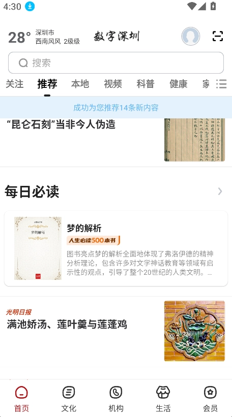 打开数字深圳App的首页,就能看到“关注”“推荐”“本地”“视频”“科普”等多个内容板块,这些板块涵盖了新闻热点、实用信息以及科普知识等内容。