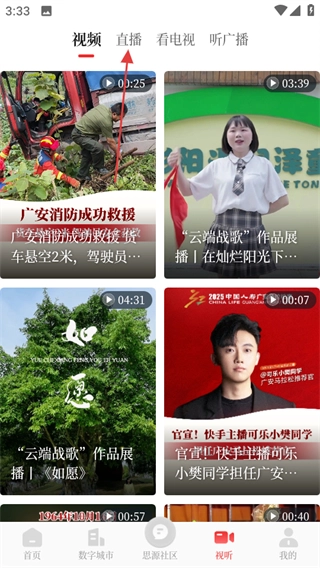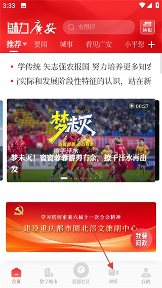 进入魅力广安后,在首页底部找到“视听”按钮并点击,即可进入视听页面。