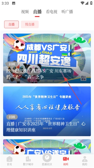 在视听页面,点击直播,进入直播列表页面。