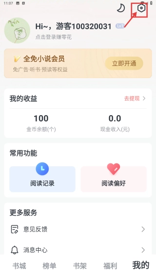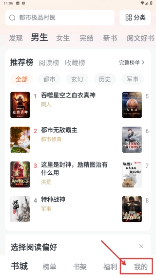 打开小说阅读类应用,点击底部的“我的”选项,进入个人中心页面。