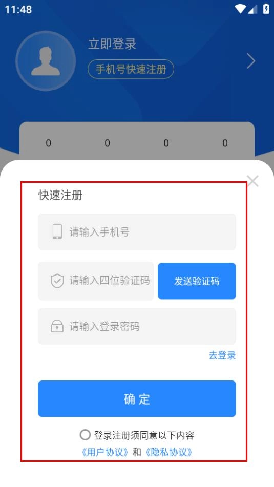 在快速注册页面,填写相关信息并勾选协议,随后点击确定按钮,即可完成注册流程。