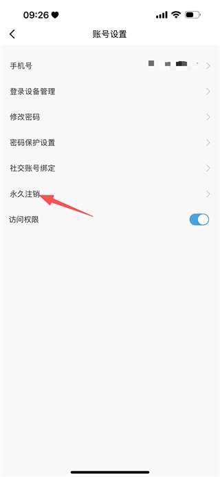 4、进入账号设置页面后,找到并点击永久注销选项,随即跳转至注销须知页面。