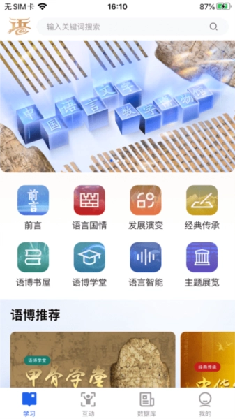 语博是中国语言文字数字博物馆的移动端应用,带我们领略文字与语言的独特魅力。在语博里,有多个精彩板块,每个板块都藏着丰富知识,等着您去探索与聆听。让我们一起走进这个奇妙天地,更深入地认识母语,体会它的韵律与内涵。