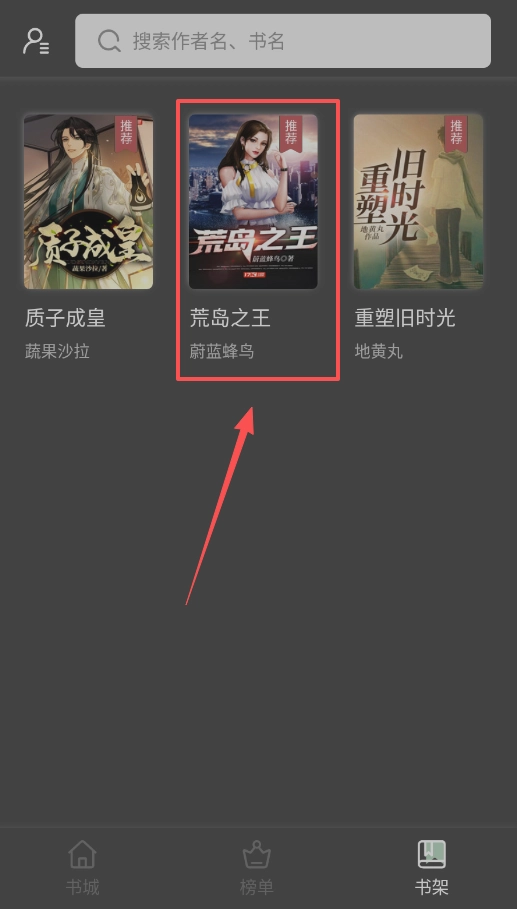 进入书城页面后,你能看到《质子成皇》《荒岛之王》等作品的封面陈列,点击其中任意一本,就能进入该作品的详情页面。