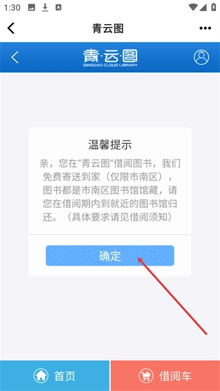 进入【青云图】页面后,会弹出温馨提示弹窗,点击【确定】按钮即可关闭提示并进入借书功能界面。