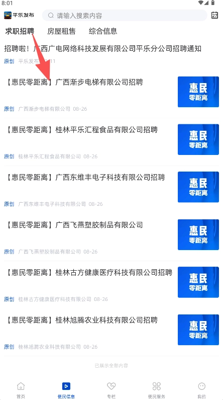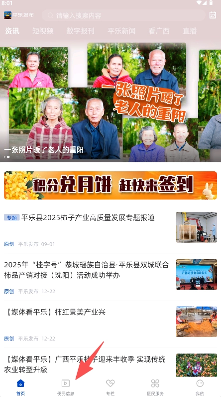 在首页底部的导航栏中,点击“便民信息”按钮,即可进入对应的板块。