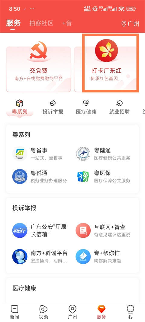 2、点击【服务】板块,即可打卡广东红,【当然你也可以选择点击其他服务】