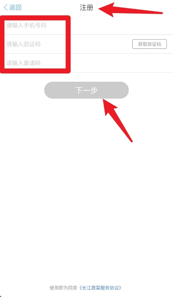 注册页面需按顺序填写手机号、验证码和邀请码,点击下一步即可完成账户注册流程。