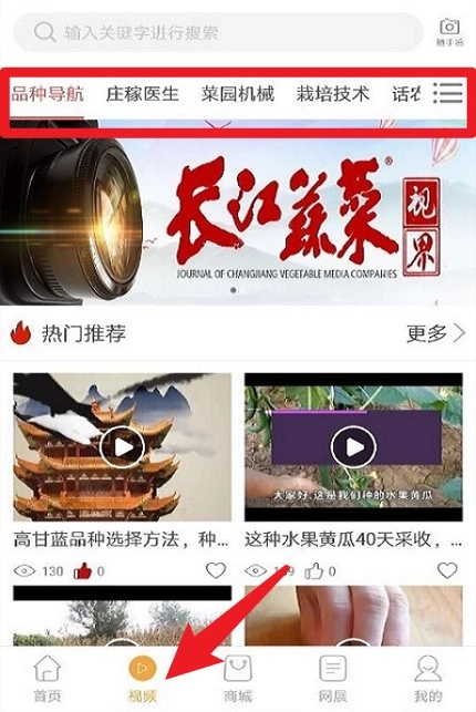 视频分类浏览:点击视频栏目,可查看品种导航、庄家医生、栽培技术、菜园机制等分类内容。