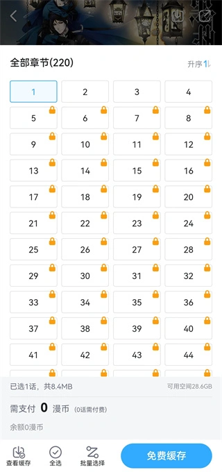2、挑选所需章节,带有锁标志的为付费章节,没有锁标志的则是免费章节。完成选择后,点击右下角的“开始”按钮。