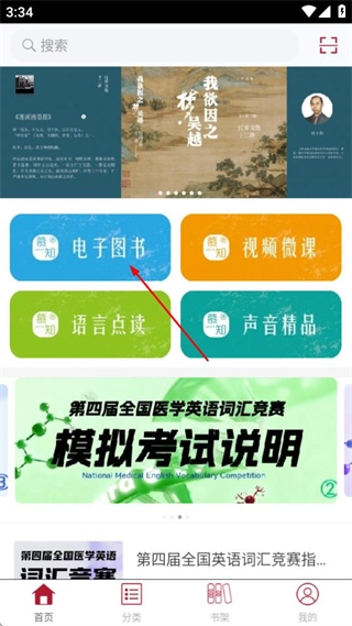 进入首页后,点击“电子图书”选项,即可进入电子图书分类页面。