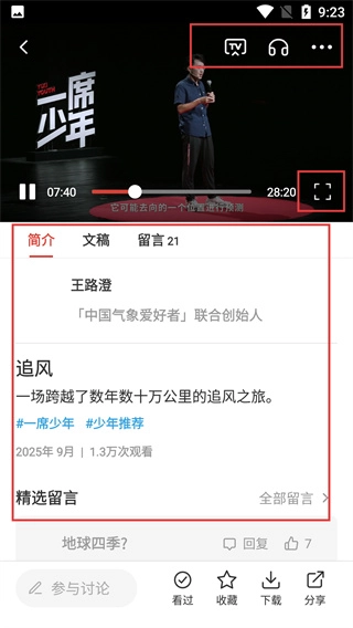4、播放演讲时,可使用全屏、TV投屏等功能,还能调整播放进度,同时可继续查看演讲的简介、标签等信息。