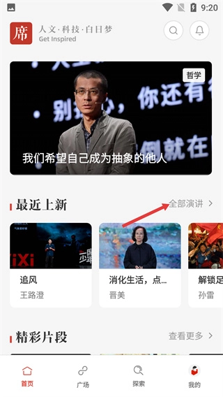 1、进入“一席”首页,可见“最近上新”演讲板块,点击板块旁的“全部演讲”按钮,即可进入演讲列表页面。
