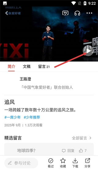 3、进入演讲详情页后,点击页面中的播放按钮可开始观看演讲,同时能查看演讲简介、文稿及观众留言等内容。