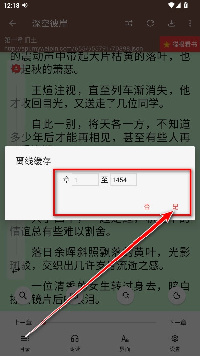 6.输入我们想要离线缓存的起始和最终章节,然后点击是就好了。